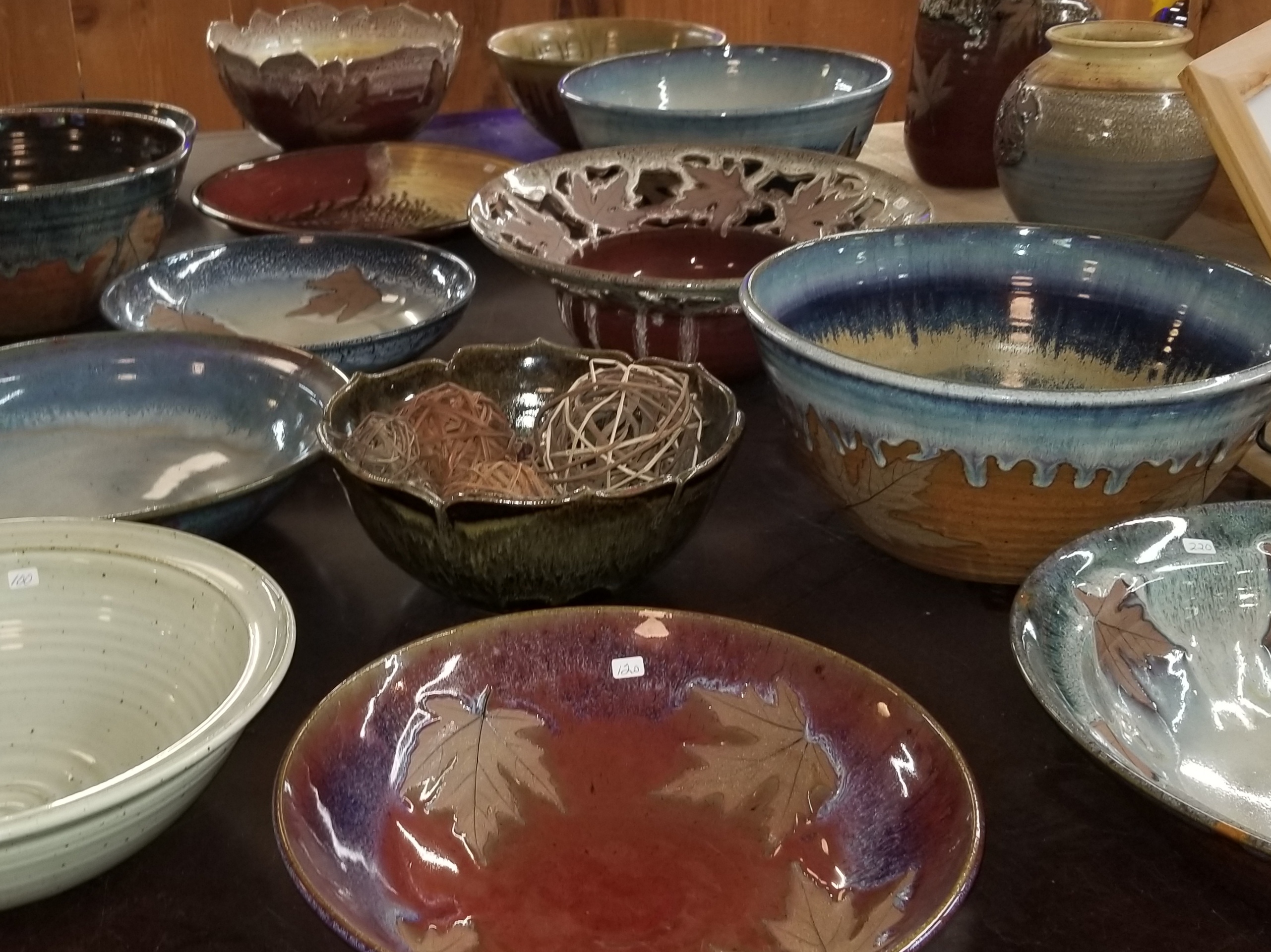 Alewine Pottery is also known for its signature design featuring the imprint of a real maple leaf, creating distinctive textures and patterns that have become a hallmark of the shop.