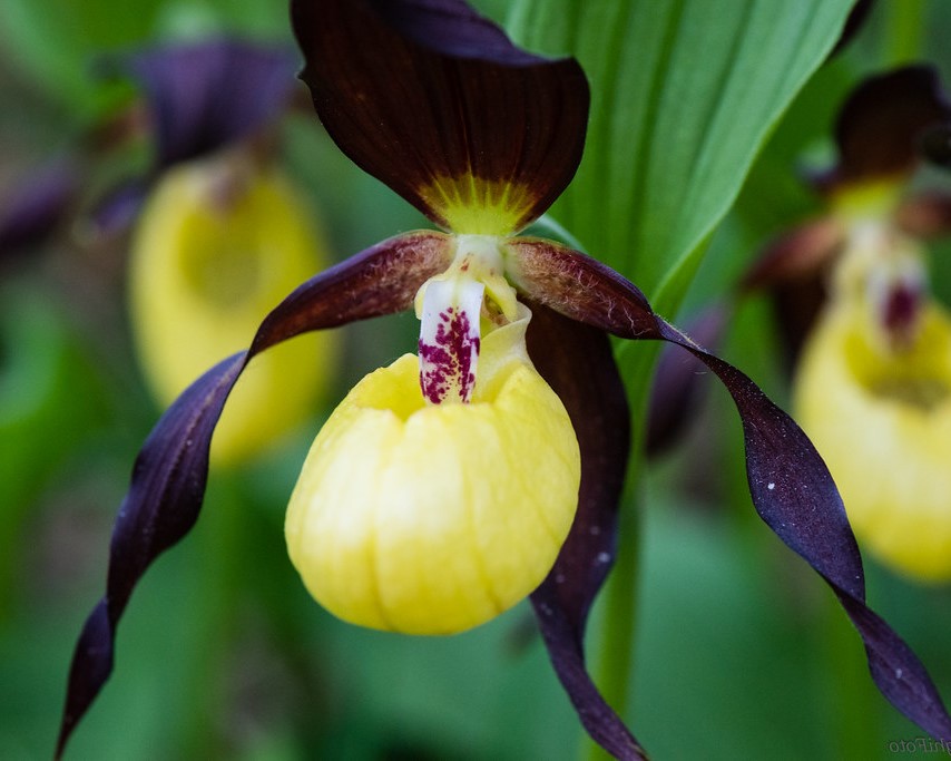The Yellow Lady's Slipper brings a burst of sunshine to the forest floor. Its bright yellow pouch is veined with purple or spotted inside, framed by long, twisting brownish-purple sepals and petals. Plants can reach 1–2 feet tall, often with multiple flowers per stem in the larger variety (var. pubescens).
